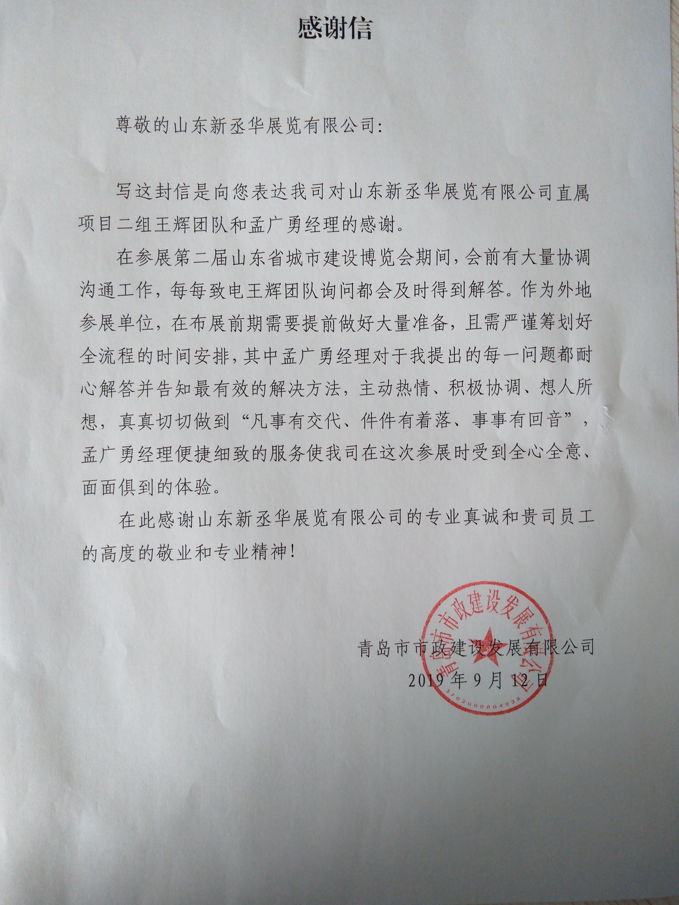 寫這封信是向您表達(dá)我司對山東新丞華展覽有限公司直屬項(xiàng)目二組王輝團(tuán)隊(duì)和孟廣勇經(jīng)理的感謝。