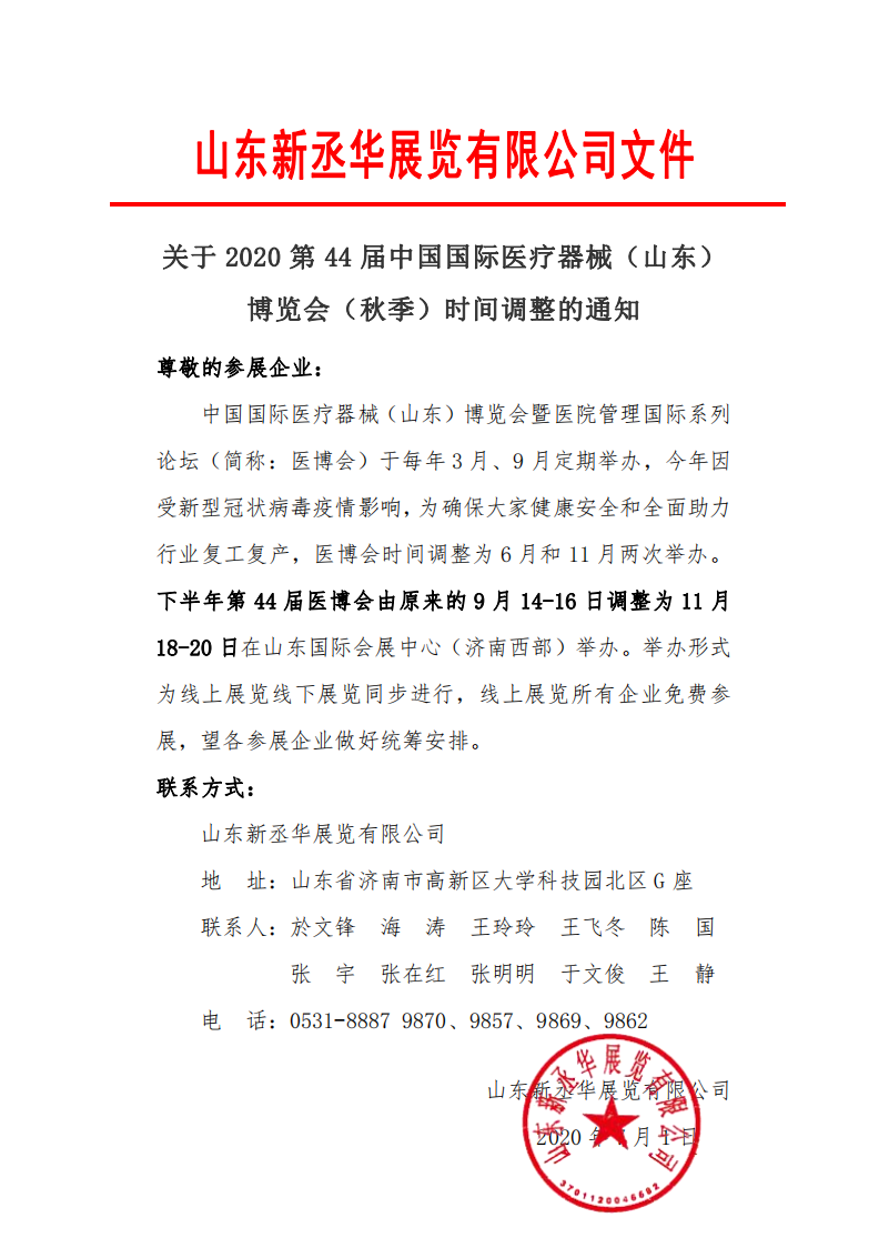 關(guān)于 2020 第 44 屆中國(guó)國(guó)際醫(yī)療器械(山東) 博覽會(huì)(秋季)時(shí)間調(diào)整的通知