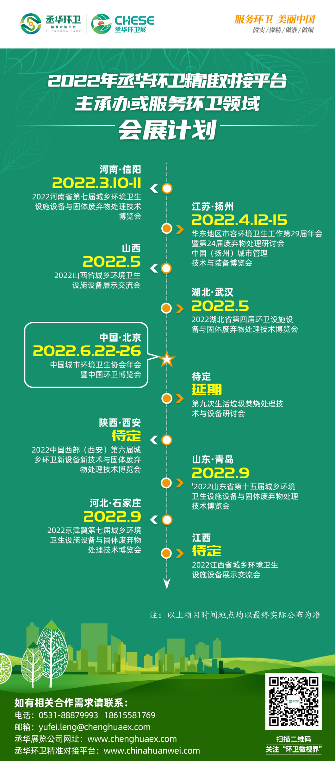 根據(jù)2022年丞華環(huán)衛(wèi)精準(zhǔn)對(duì)接平臺(tái)規(guī)劃,丞華環(huán)衛(wèi)展將繼續(xù)在河南、山東、河北、湖北、山西、陜西、江西等省市舉辦,紅旗插遍大江南北,服務(wù)遍及神州東西。此外,受疫情影響延期的華東地區(qū)市容環(huán)衛(wèi)協(xié)會(huì)(學(xué)會(huì))聯(lián)席會(huì)年會(huì)暨博覽會(huì)、中國城市環(huán)境衛(wèi)生協(xié)會(huì)年會(huì)暨博覽會(huì)將分別于4月份、6月份在揚(yáng)州、北京舉辦,還將參與組織焚燒大會(huì)等高端會(huì)議論壇活動(dòng),為環(huán)衛(wèi)固廢行業(yè)產(chǎn)業(yè)鏈企業(yè)提供多樣化會(huì)展選擇、全年全程對(duì)接服務(wù)!