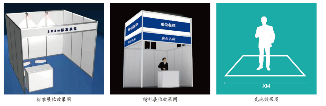 2. 精標展位基本配置:3m×3m展位(包括精裝標準展臺、布幅廣告門楣、地毯、一桌兩椅、門楣射燈、展位射燈、220V電源插座);