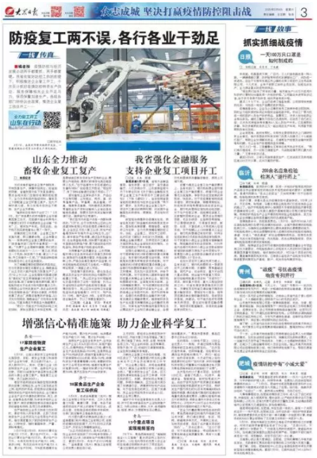 ■編者按 疫情防控與經(jīng)濟發(fā)展必須兩手都要抓、兩手都要硬。我省在做好防控工作的前提下,積極推進企業(yè)復工開工,千方百計抓好疫情防控物資生產(chǎn)供應,服務保障相關(guān)企業(yè)開足馬力,保質(zhì)保量加速生產(chǎn)。各級各部門紛紛出臺政策,推進企業(yè)復工項目開工……