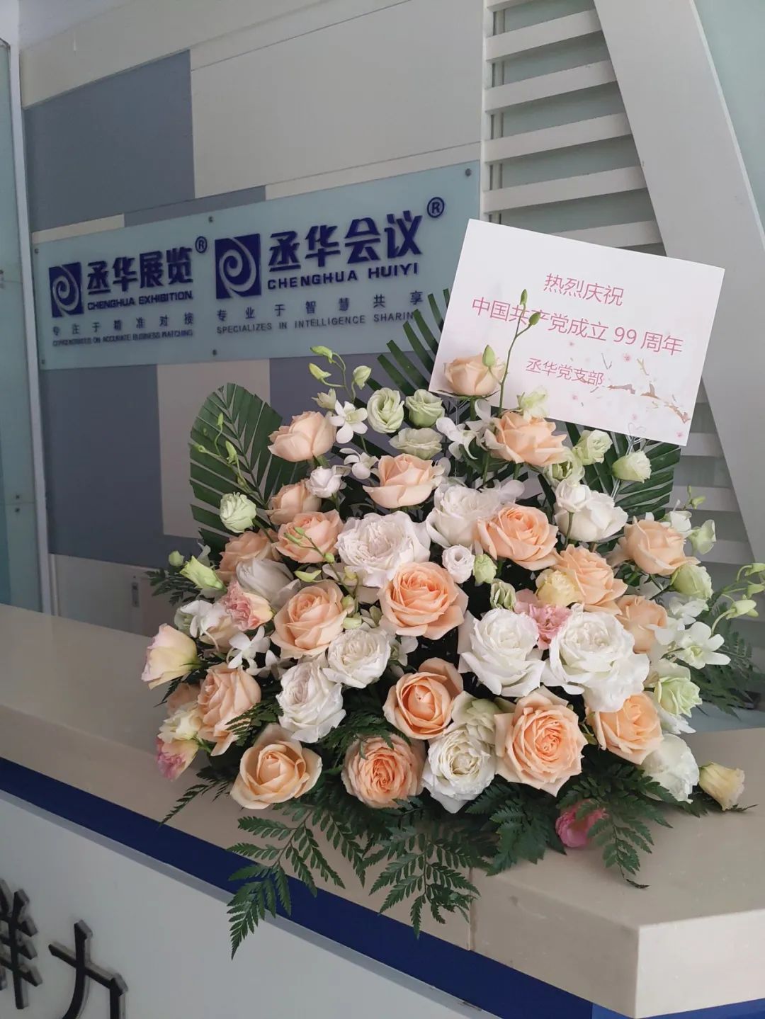 7月1日早上,山東新丞華展覽有限公司黨支部在前臺擺放了美麗的鮮花,慶祝中國共產(chǎn)黨成立 99周年。