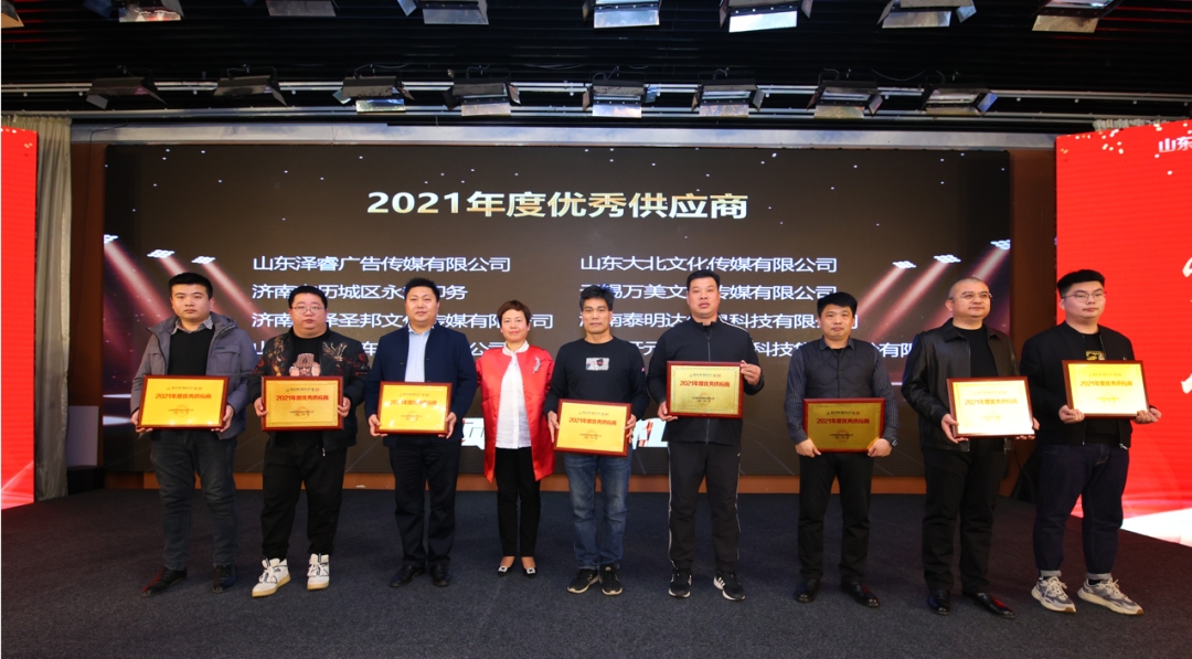 經(jīng)過公司各項(xiàng)目部門和職能部門的共同推薦,山東澤睿廣告?zhèn)髅接邢薰尽⑸綎|大北文化傳媒有限公司、濟(jì)南市歷城區(qū)永超印務(wù)、無錫萬美文化傳媒有限公司、濟(jì)南天澤圣邦文化傳媒有限公司、濟(jì)南泰明達(dá)信息科技有限公司、山東鑫派汽車服務(wù)有限公司、世紀(jì)開元智印互聯(lián)科技集團(tuán)股份有限公司8家合作單位獲得2021年度優(yōu)秀合作供應(yīng)商獎(jiǎng)項(xiàng)。